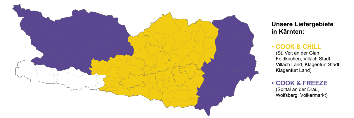 In den Bezirken St. Veit an der Glan, Feldkirchen, Villach Stadt und Land sowie Klagenfurt Stadt und Land versorgen wir unsere Kund*innen mit Cook & Chill. Die Menüs werden frisch zubereitet, vormittags zugestellt und können einfach zu Hause genossen werden. Das Angebot eignet sich besonders für Menschen, die Wert auf eine regelmäßige tägliche Versorgung legen.
