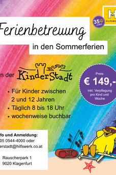 Die KinderStadt Klagenfurt bietet in den Ferien (Semester-, Oster-, Sommer-, Herbst- und Weihnachtsferien) pauschale Ferienbetreungsangebote an. Für eine Woche (Montag bis Freitag), von 8 bis 18 Uhr betereuen wir Ihr Kind inkl. Mittagessen für 149 Euro (pauschal, pro Kind und Woche)
