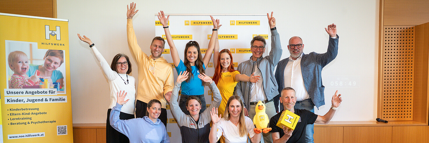Gruppenfoto: v.l.n.r. 1. Reihe: Tamara Nord (Kindergarten- und Hortpädagogin), Jennifer Goldnagl (Sportwissenschafterin, Trainingstherapeutin), Isabella Ecker (Fachreferat Kinder, Jugend, Familie und Psychosoziale Dienste, Hilfswerk Österreich), Peter Rathammer (Lehrender an der Pädagogischen Hochschule Wien für den Bereich Bewegung und Sport Primarstufe) v.l.n.r. 2. Reihe: Katharina Rokvić (Geschäftsbereichsleitung Kinder, Jugend und Familie, Hilfswerk NÖ), Lukas Nord (Geschäftsführer und Inhaber der Holdhaus & Nord GmbH.), Elena Eidler (Simply Strong.), Stephanie Dobrowsky (Gründerin „Die pädagogische Wunderwerkstatt“), Thomas Mlinek (Leiter der Koordinationsstelle „Tägliche Bewegungseinheit“), Christoph Gleirscher (Geschäftsführer Hilfswerk Niederösterreich)