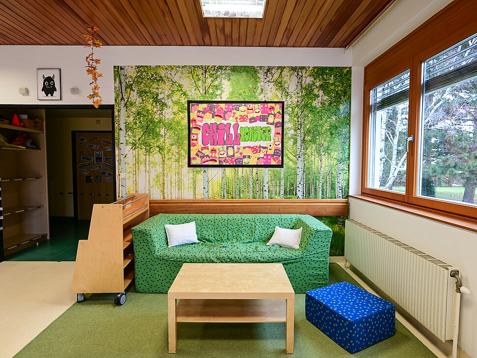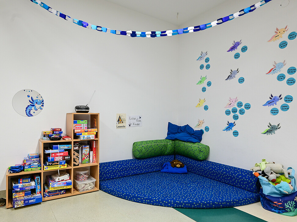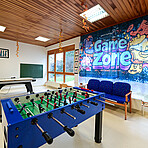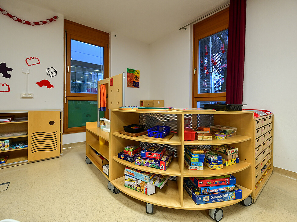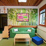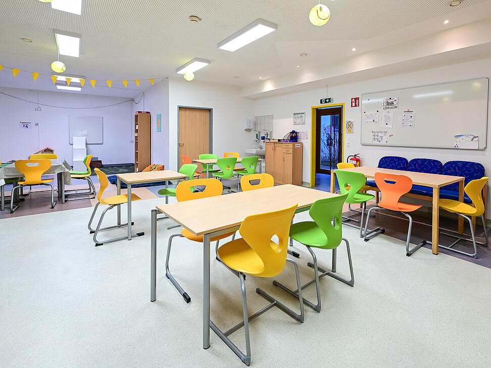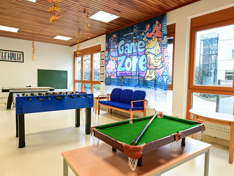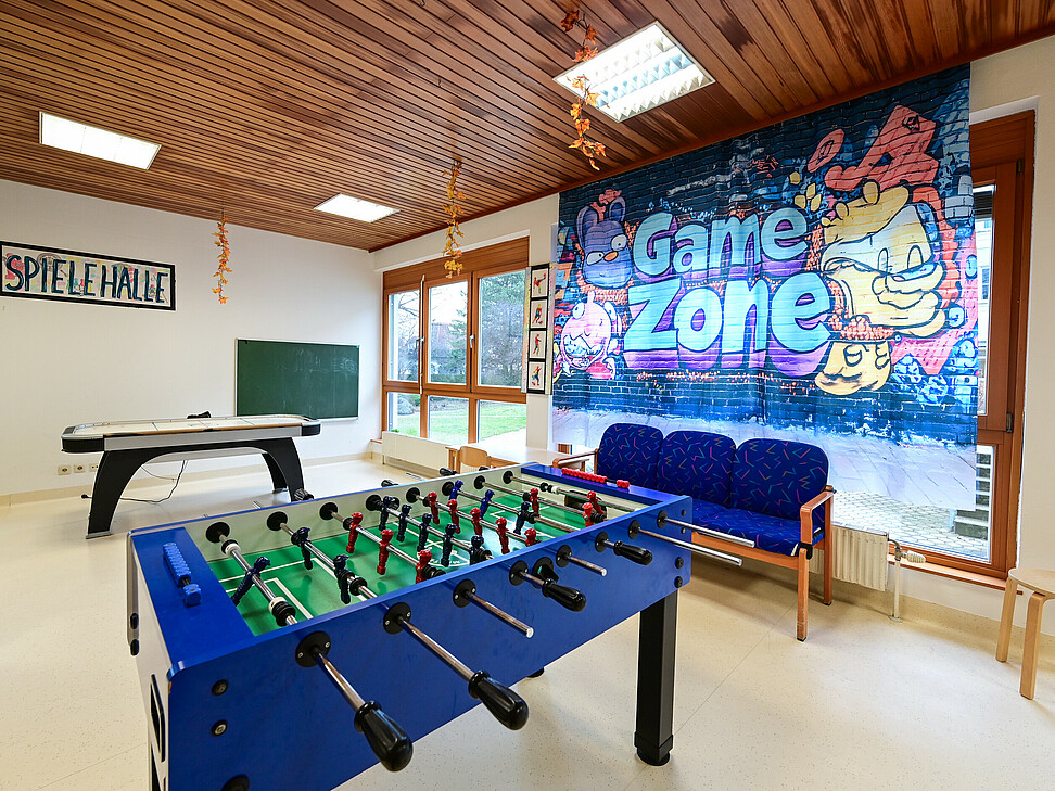 Neben den eigenen Gruppenräumen stehen uns weitere Räumlichkeiten zur Verfügung, darunter eine Spielehalle sowie ein Aktivitätenraum.