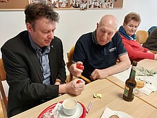 Nach der Stärkung in Form von Kaffee und Kuchen wurde miteinander mit den bunt gefärbten Eiern „gepeckt. Auch Bürgermeister Nicon Baumgartner ließ es sich nicht nehmen persönlich vorbeizuschauen und mit von der Partie zu sein. Die Besucherinnen und Besucher hatten dabei sichtlich Freude und genossen gemeinsam den gemütlichen Nachmittag.