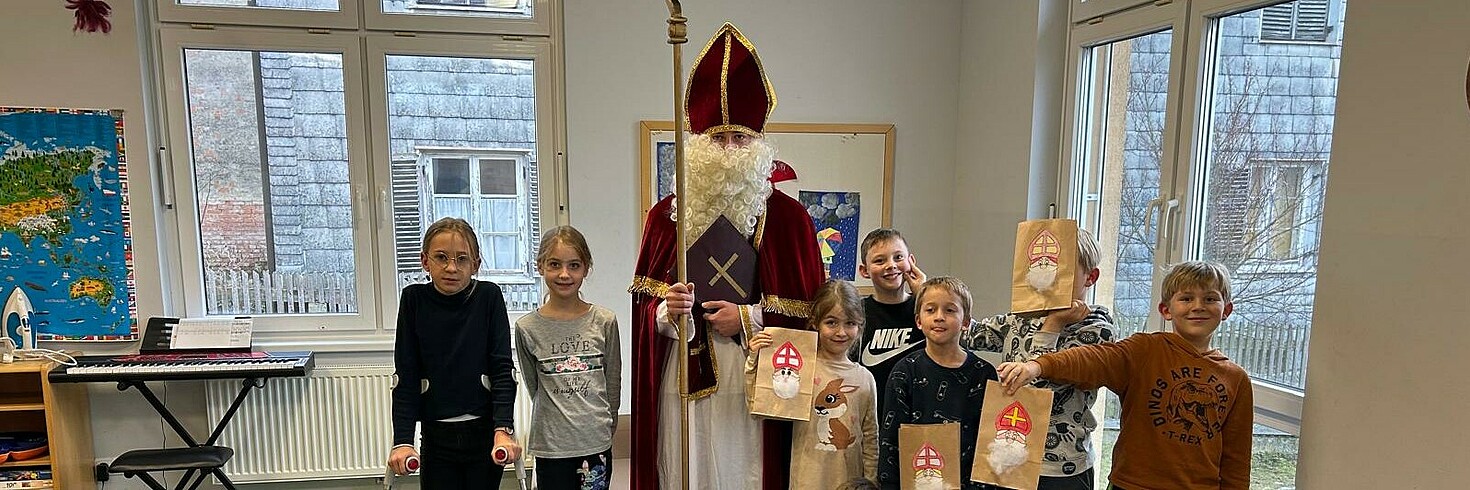 Alle freuten sich sehr über die willkommene Abwechslung. Die Erstklässler trugen ihm ein schönes Gedicht vor und alle sangen zur Begrüßung das bekannte und beliebte Nikolauslied „Lasst uns froh und munter sein“. Mit dem großen Versprechen, auch nächstes Jahr wieder zu kommen, verabschiedete sich der Nikolaus. Natürlich durfte zur Erinnerung ein Gruppenfoto nicht fehlen.