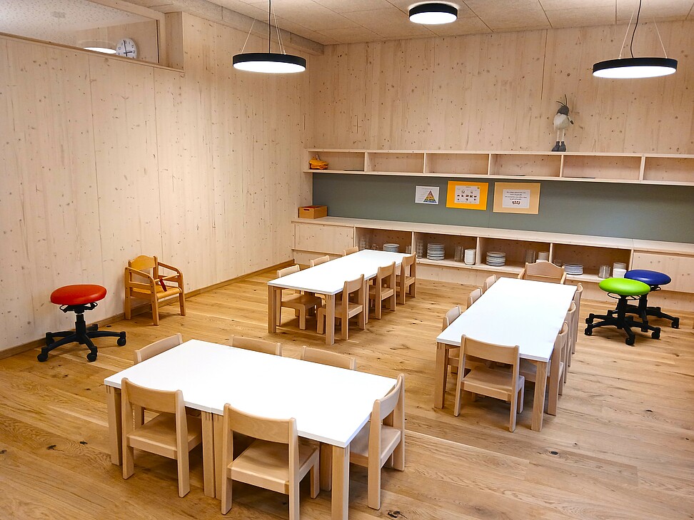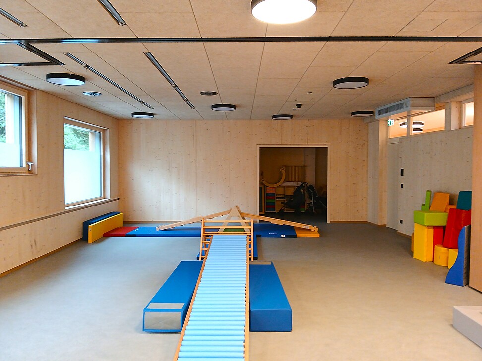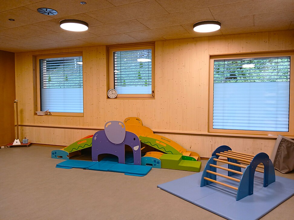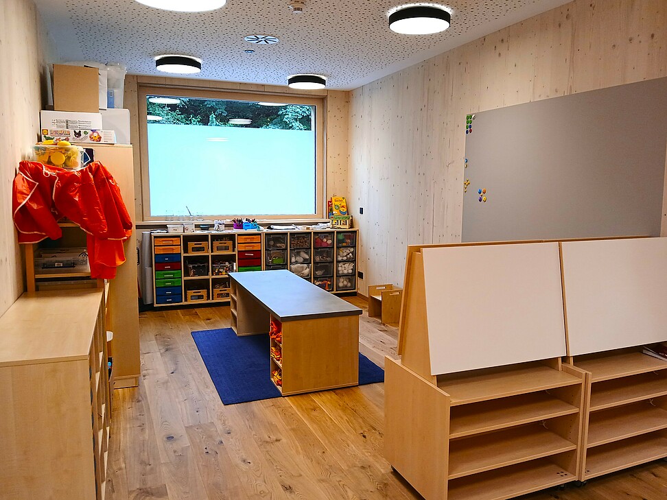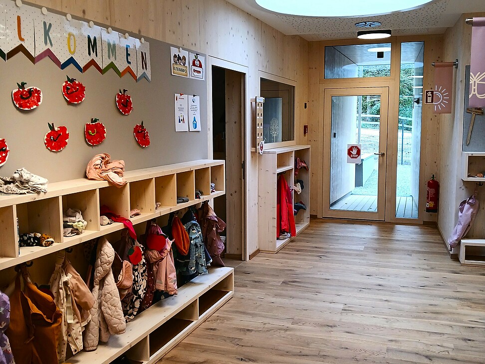 Die 10 Gruppenräume befinden sich im Erdgeschoß des U-förmig angeordneten Gebäudes. In den beiden „Zwergenbistros“ gibt es täglich eine gesunde Jause, die nach regionalen und saisonalen Schwerpunkten zubereitet wird. Täglich stehen Obst, Gemüse, Getreideprodukte, Milchprodukte und Trinkwasser für die Kleinen bereit. Von Zeit zu Zeit helfen die Kinder auch mit, verschiedene Köstlichkeiten selbst herzustellen, z.B. Brot backen, Obstsalat schneiden u.v.m. Die Räume strahlen Gemütlichkeit aus und wurden hauptsächlich in massiver Holzbauweise ausgeführt. Die Innenwände sind teilweise mit Lehm verputzt, was die Atmosphäre in den Gruppen erdig und natürlich erscheinen lässt. Auf den beiden Terrassen befinden sich die Spielplätze für die Kinder, die direkt von den Garderoben aus erreichbar sind. Schaukeln, Rutschen, Sandkästen und viel Platz zum Toben ermöglichen große Bewegungsfreiheit. Es gibt auch drei Bewegungsräume, wo nach Herzenslust geturnt, gekraxelt und gelaufen werden kann. Das Gebäude wurde klimaaktiv errichtet; auf dem Dach befindet sich eine PV-Anlage. Die MIKADO-Kinderlandschaft wurde mit der Deklaration „klimaaktiv Gold“ ausgezeichnet.