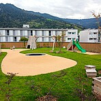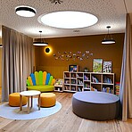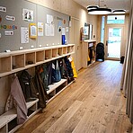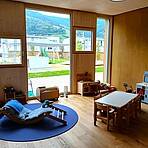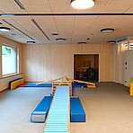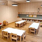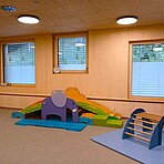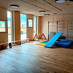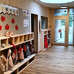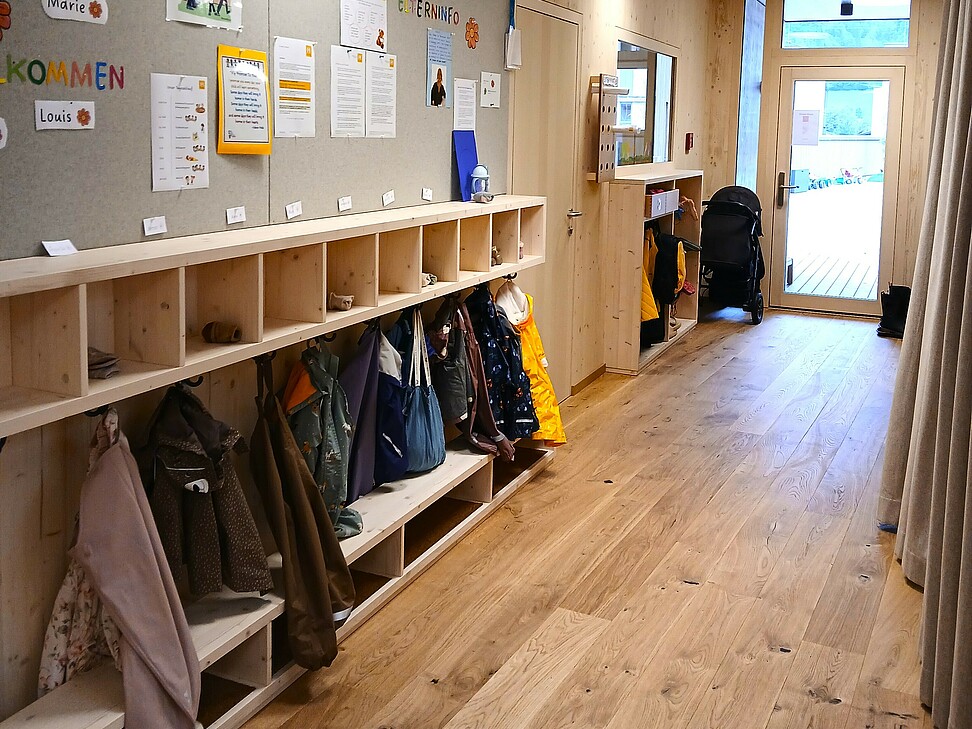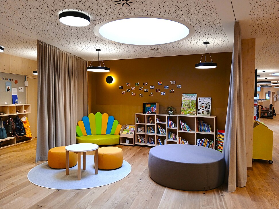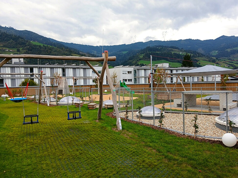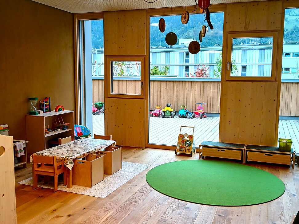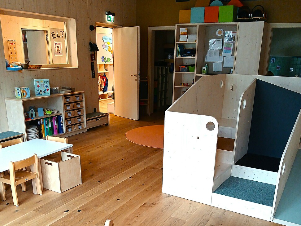 Die 10 Gruppenräume befinden sich im Erdgeschoß des U-förmig angeordneten Gebäudes. In den beiden „Zwergenbistros“ gibt es täglich eine gesunde Jause, die nach regionalen und saisonalen Schwerpunkten zubereitet wird. Täglich stehen Obst, Gemüse, Getreideprodukte, Milchprodukte und Trinkwasser für die Kleinen bereit. Von Zeit zu Zeit helfen die Kinder auch mit, verschiedene Köstlichkeiten selbst herzustellen, z.B. Brot backen, Obstsalat schneiden u.v.m. Die Räume strahlen Gemütlichkeit aus und wurden hauptsächlich in massiver Holzbauweise ausgeführt. Die Innenwände sind teilweise mit Lehm verputzt, was die Atmosphäre in den Gruppen erdig und natürlich erscheinen lässt. Auf den beiden Terrassen befinden sich die Spielplätze für die Kinder, die direkt von den Garderoben aus erreichbar sind. Schaukeln, Rutschen, Sandkästen und viel Platz zum Toben ermöglichen große Bewegungsfreiheit. Es gibt auch drei Bewegungsräume, wo nach Herzenslust geturnt, gekraxelt und gelaufen werden kann. Das Gebäude wurde klimaaktiv errichtet; auf dem Dach befindet sich eine PV-Anlage. Die MIKADO-Kinderlandschaft wurde mit der Deklaration „klimaaktiv Gold“ ausgezeichnet.