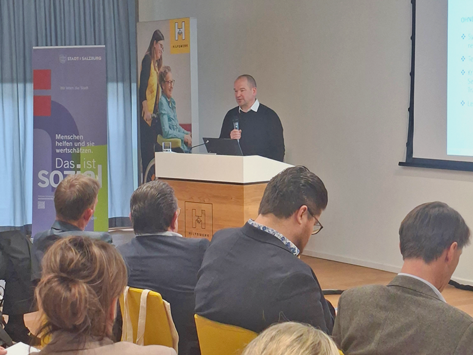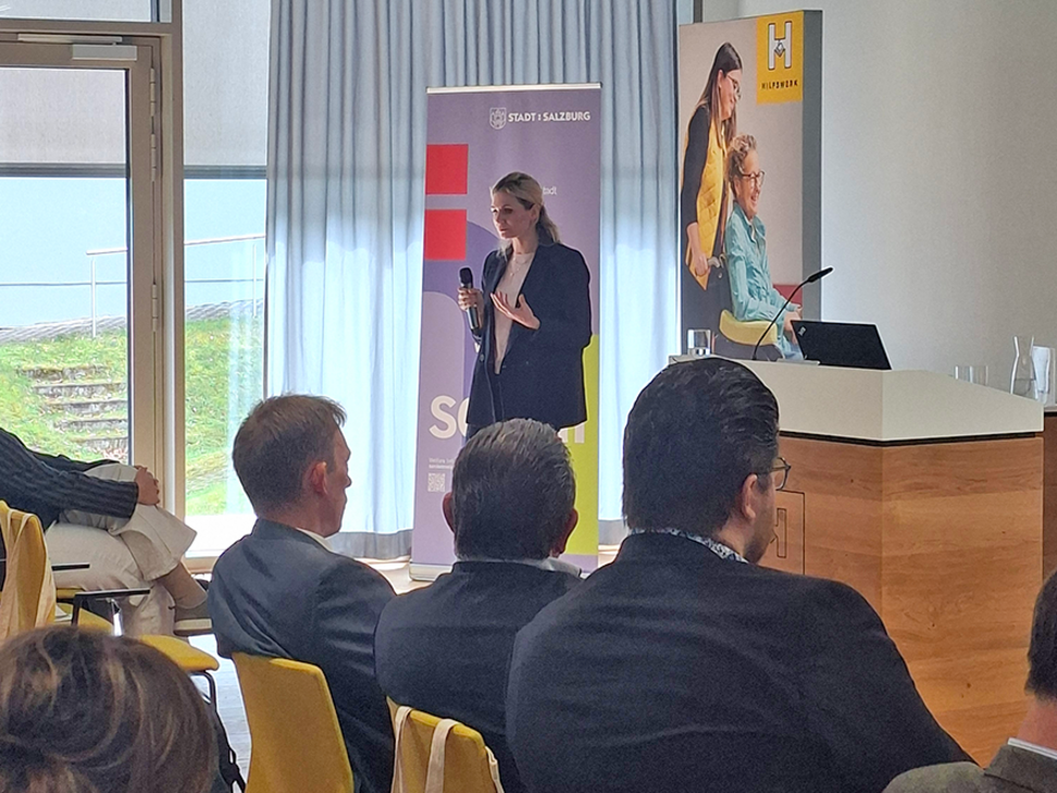 Nach Einführungsworten von Mag. Hermann Hagleitner, Geschäftsführer des Hilfswerk Salzburg, bildete Soziallandesrat Mag. Dr. Wolfgang Fürweger, MSc. den Auftakt. Er betonte in seiner Begrüßung die Bedeutung innovativer Lösungsansätze für die Pflege. Im weiteren Verlauf beleuchtete MMag.a Dr.in Elisabeth Rappold, Leiterin der Abteilung Gesundheitsberufe und Langzeitpflege der Gesundheit Österreich GmbH, die Rolle der stationären Langzeitpflege als tragende Säule des Versorgungssystems. Sie zeigte auf, wie professionelle Pflege durch klare Kompetenzverteilungen und gestärkte fachliche Verantwortung wirksam zur Versorgungsqualität beiträgt.