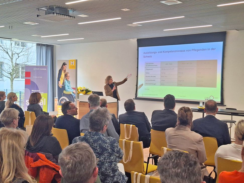 Am Nachmittag rückte die Pflegequalität unter veränderten Personalrealitäten in den Mittelpunkt. Prof.in Dr.in Heidrun Gattinger, Leiterin am Institut für Gesundheitswissenschaften der OST - Ost-Schweizer Fachhochschule, zeigte anhand aktueller Forschungsergebnisse, wie Qualität auch bei knappen personellen Ressourcen gesichert werden kann. Entscheidend sind dabei klare Strukturen, evidenzbasierte Ansätze und ein gezielter Einsatz vorhandener Kompetenzen.