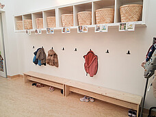 Um sicherzustellen, dass sich sowohl die Kinder als auch deren Bezugspersonen von Anfang an wohlfühlen, werden Eltern aktiv in den Alltag eingebunden. Von der Begleitung des Eingewöhnungsprozesses bis hin zur Mitgestaltung in unseren Familienhäusern – jede Familie trägt zur Gestaltung einer vertrauten und liebevollen Umgebung bei. Diese Familienhäuser hängen auf Augenhöhe der Kinder und schaffen so ein Gefühl von Vertrautheit und Zuhause. Der Garderobenbereich erzählt Geschichten durch regelmäßig aktualisierte Fotos der Kinder, die den Eltern einen lebendigen Einblick in den bunten Alltag ermöglichen. Transparenz und Einbindung stehen im Mittelpunkt, um gemeinsam mit den Familien eine Umgebung zu schaffen, in der sich die Kinder sicher und geborgen fühlen.