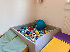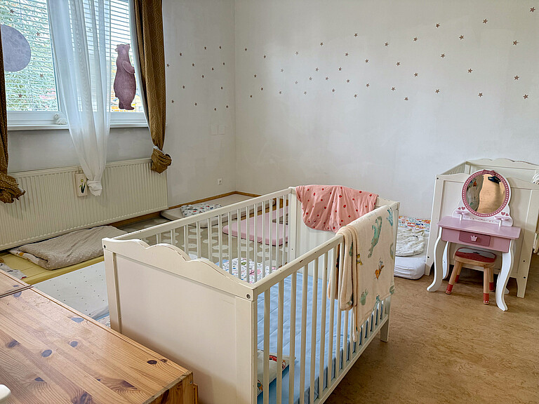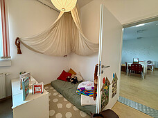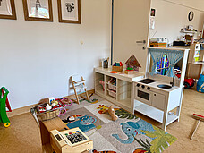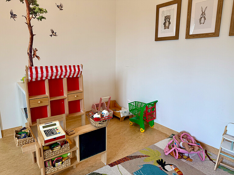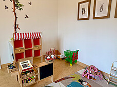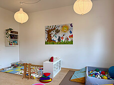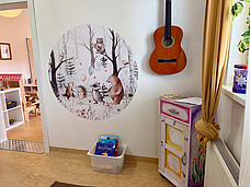 Um sicherzustellen, dass sich sowohl die Kinder als auch deren Bezugspersonen von Anfang an wohlfühlen, werden Eltern aktiv in den Alltag eingebunden. Von der Begleitung des Eingewöhnungsprozesses bis hin zur Mitgestaltung in unseren Familienhäusern – jede Familie trägt zur Gestaltung einer vertrauten und liebevollen Umgebung bei. Diese Familienhäuser hängen auf Augenhöhe der Kinder und schaffen so ein Gefühl von Vertrautheit und Zuhause. Der Garderobenbereich erzählt Geschichten durch regelmäßig aktualisierte Fotos der Kinder, die den Eltern einen lebendigen Einblick in den bunten Alltag ermöglichen. Transparenz und Einbindung stehen im Mittelpunkt, um gemeinsam mit den Familien eine Umgebung zu schaffen, in der sich die Kinder sicher und geborgen fühlen.