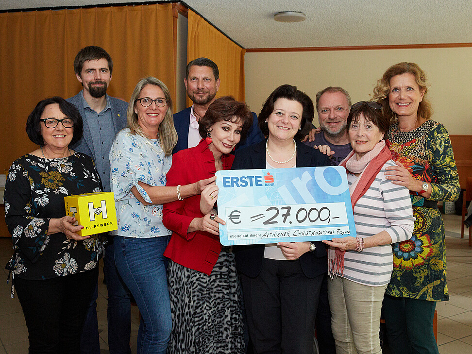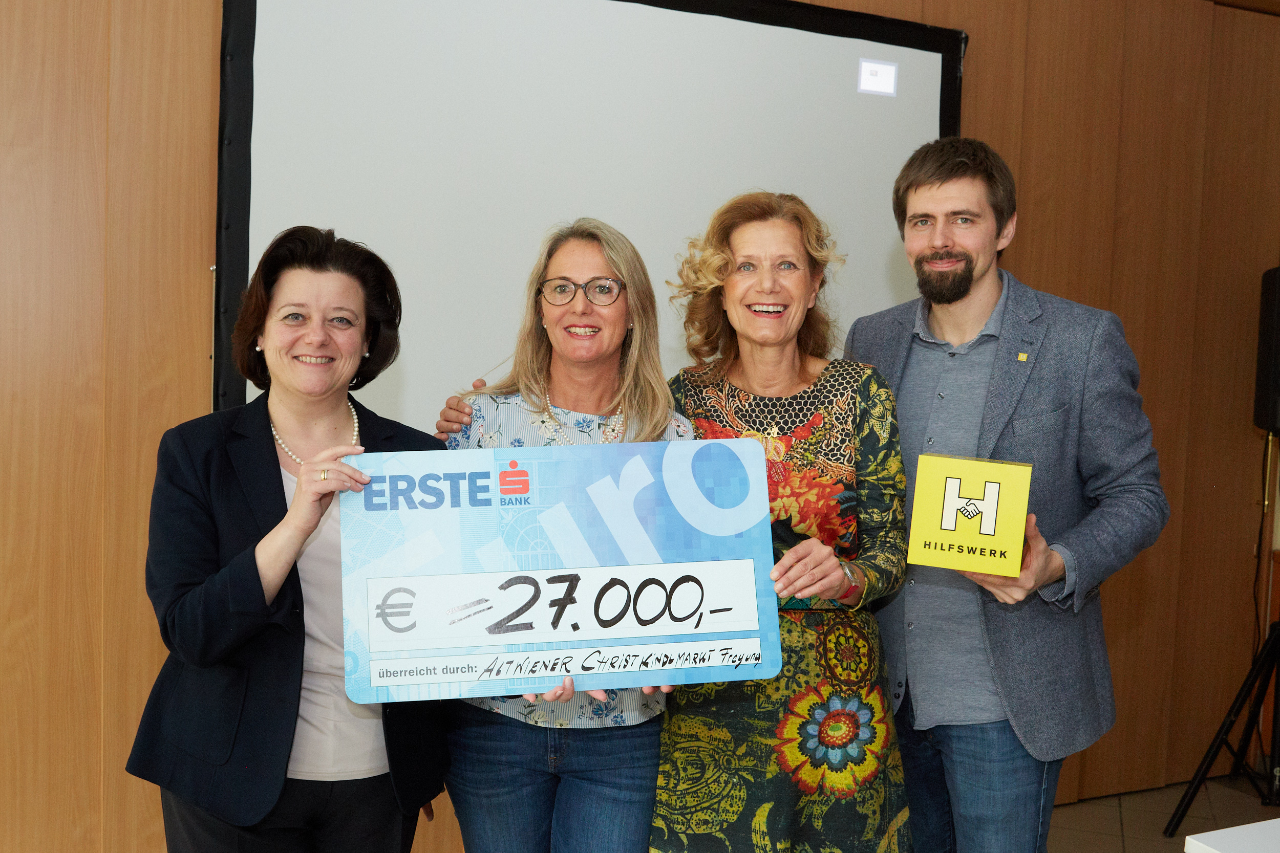 Altwiener Christkindlmarkt-Geschäftsführerin Alexandra Holzer präsentierte Anfang April 2019 in der Wiener Hilfswerk-Zentrale in der Schottenfeldgasse das Spendenergebnis. So durften sich Wiener Hilfswerk-Geschäftsführerin Sabine Geringer und Hilfswerk-Nachbarschaftszentren-Leiter Michael Eibensteiner über einen Scheck in Höhe von 27.000 EUR freuen. Christkindlmarkt-Geschäftsführerin Holzer verwies darauf, dass der Markt seit seinem Beginn in den 80er Jahren immer auch karitativ tätig gewesen war. Sie lobte die Zusammenarbeit mit dem Team des Wiener Hilfswerks und das Engagement der freiwilligen Unterstützer/innen der Organisation.